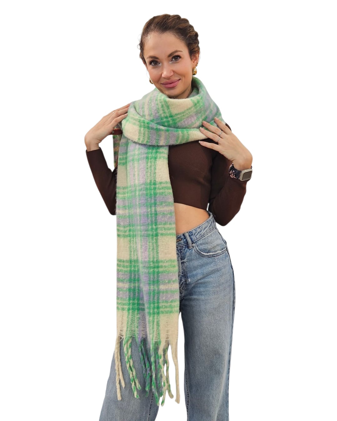 La bufanda larga, suave y súper calentita combina estilo y confort. Con un diseño escocés y un mix de tres colores: rosa suave, lila pastel y crema. Esta combinación le da vida a cualquier look. Hecha con 30% lana y 70% viscosa, te mantendrá abrigada y con una textura suave y ligera.