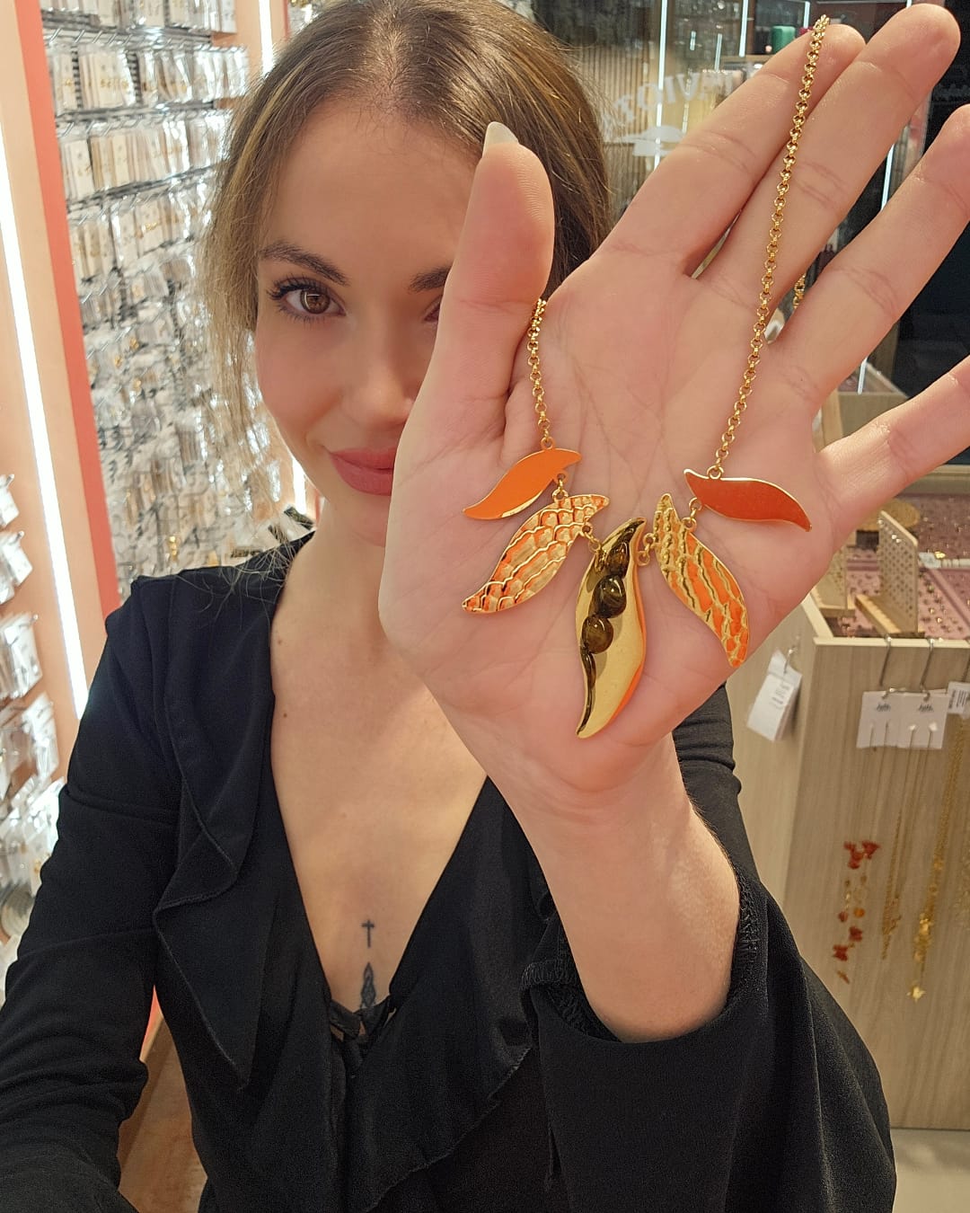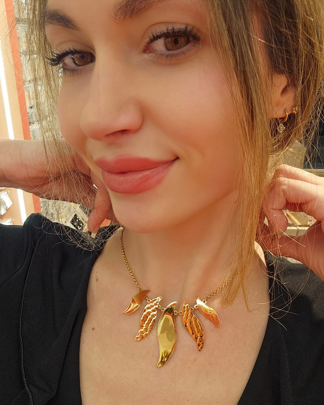 No es un collar, es movimiento, luz y actitud. Eclipse Botánico combina hojas orgánicas con un acabado espejo que atrapa cada reflejo. Fabricado en acero inoxidable en dorado y plateado, pensado para brillar en cámara y en la vida real. Minimal desde lejos, es hipnótico de cerca.