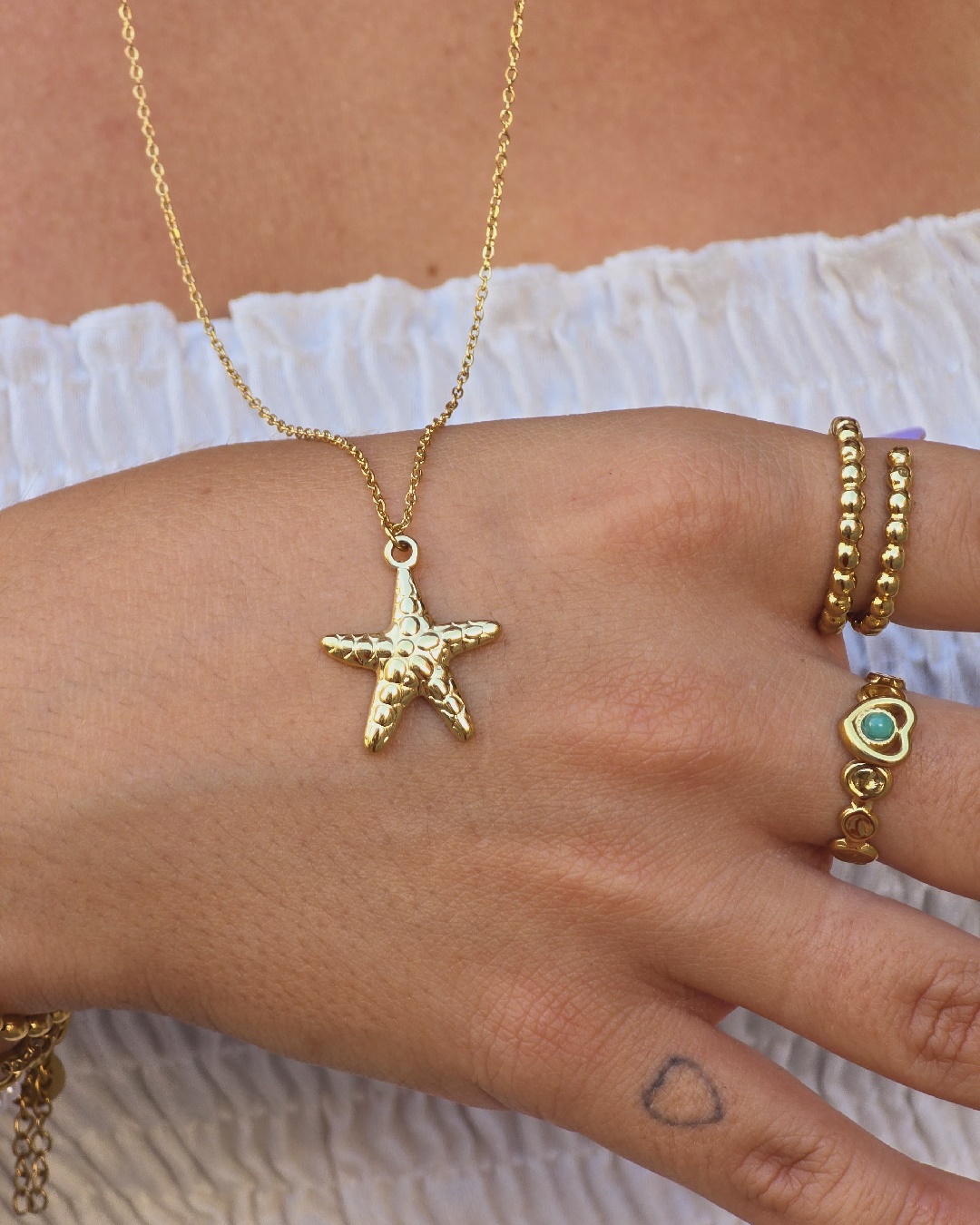 Este collar lleva un charm de colgante de una preciosa estrella de mar. Destacará en tu cuello por la forma tan viscosa y original que tiene. Fabricado con acero inoxidable y baño de oro de alta calidad, nuestros collares garantizan una durabilidad excepcional. 100% Waterproof