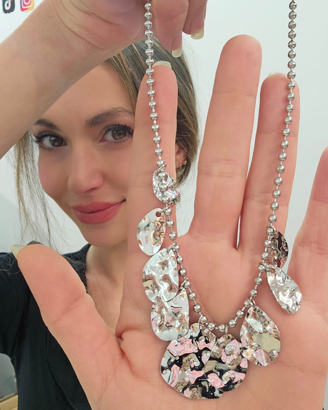 El collar tiene una estructura equilibrada que se adapta al cuello de forma natural. Cada elemento refleja la luz de manera distinta, logrando un efecto sofisticado y contemporáneo. Es resistente al agua, no se oxida y es apto para piel sensible.