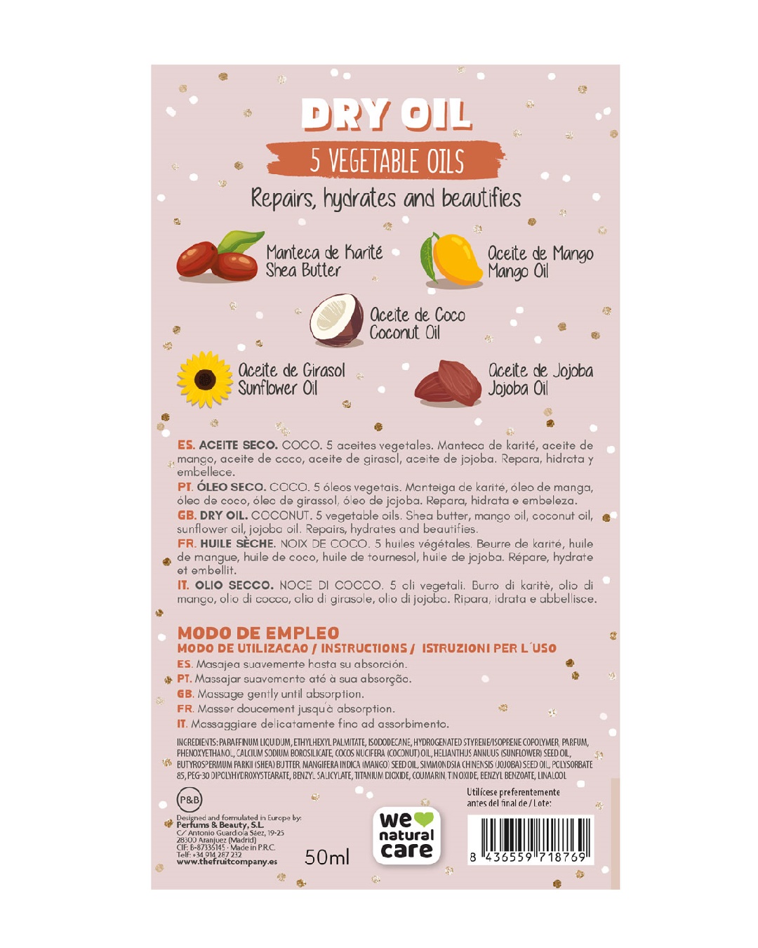 Aceite Seco con 5 aceites vegetales que reparan, hidratan y embellecen: manteca de karité, aceite de mango, aceite de girasol, acete de coco y aceite de jojoba.