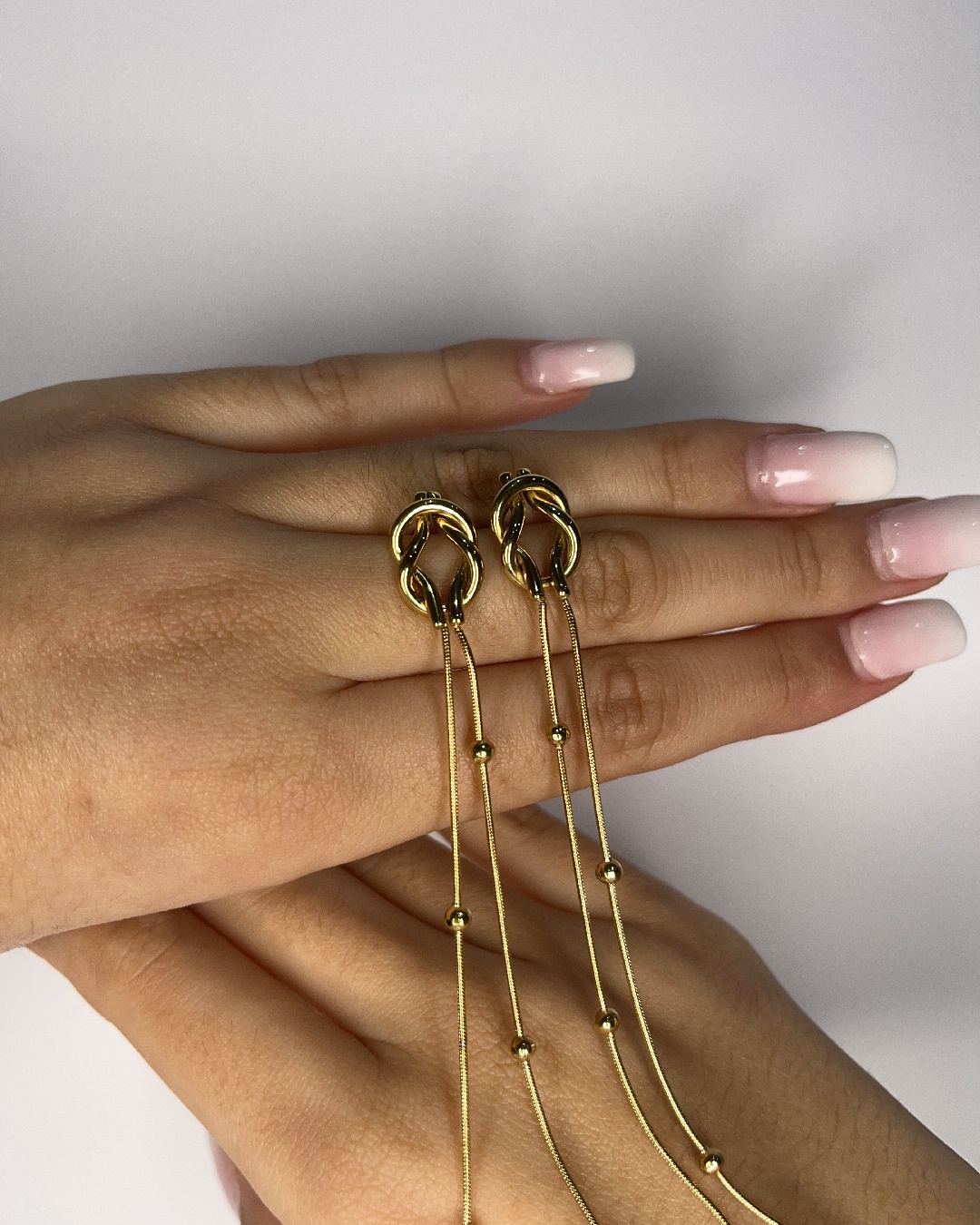 Este pendiente de acero con un nudo del que cuelgan dos tiras con bolitas es una joya que combina simplicidad con un toque de elegancia. El diseño del nudo puede simbolizar la conexión y el vínculo, mientras que las tiras y las bolitas pueden añadir un toque de gracia y movimiento, representando la fluidez en la vida.