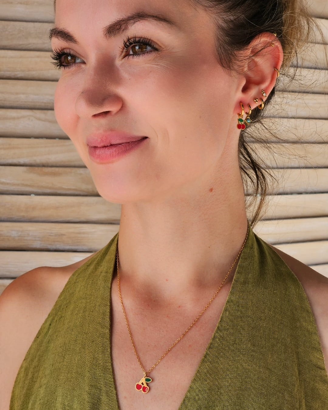 Descubre nuestras golosas piezas de esta colección con este dúo de cerezas rojas y esmaltadas. . Este tipo de pendiente es versátil y atemporal, adecuado tanto para ocasiones cotidianas como para eventos más formales. Su diseño lo hace popular entre una amplia gama de edades y estilos.Fabricado con acero inoxidable y baño de oro de alta calidad, nuestros collares garantizan una durabilidad excepcional. 100% Waterproof