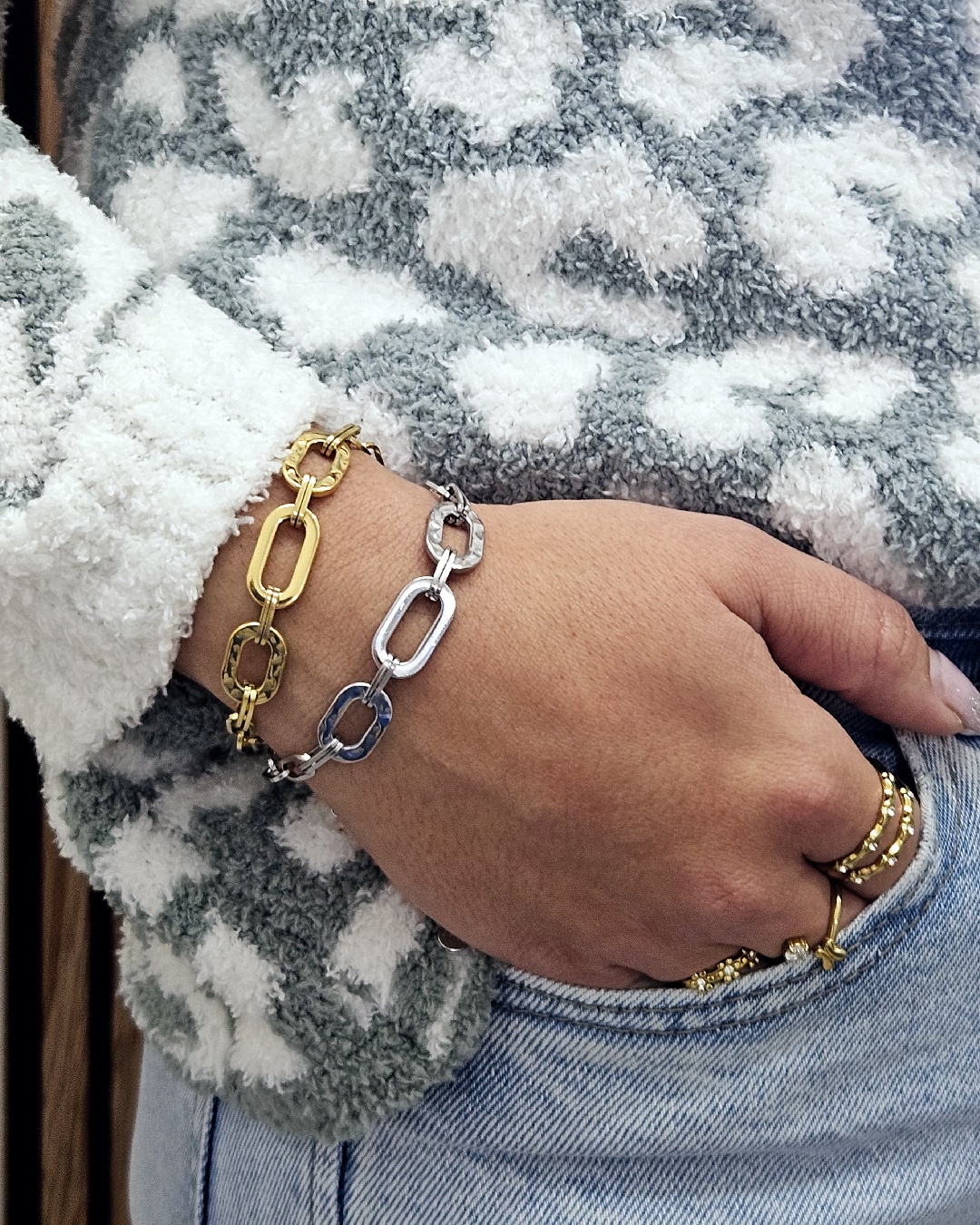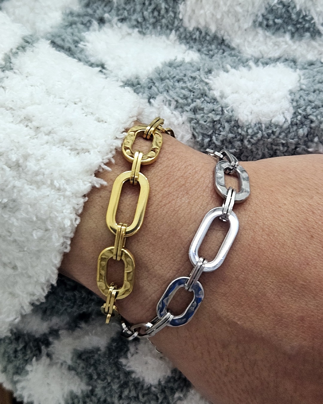 Una pulsera de eslabones en varios tamaños, perfecta para llevar como brazalete de diario. Combinala con cualquiera de tus joyas. Fabricado con acero inoxidable y baño de oro de alta calidad ✨, nuestra pulsera garantiza una durabilidad excepcional y una resistencia impecable al desgaste diario. Su diseño ajustable permite adaptarse a varias medidas de muñeca. 100% Waterproof🌊