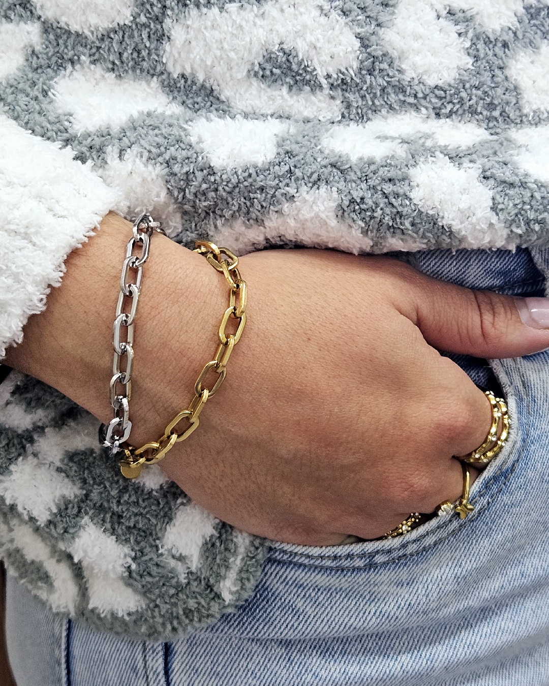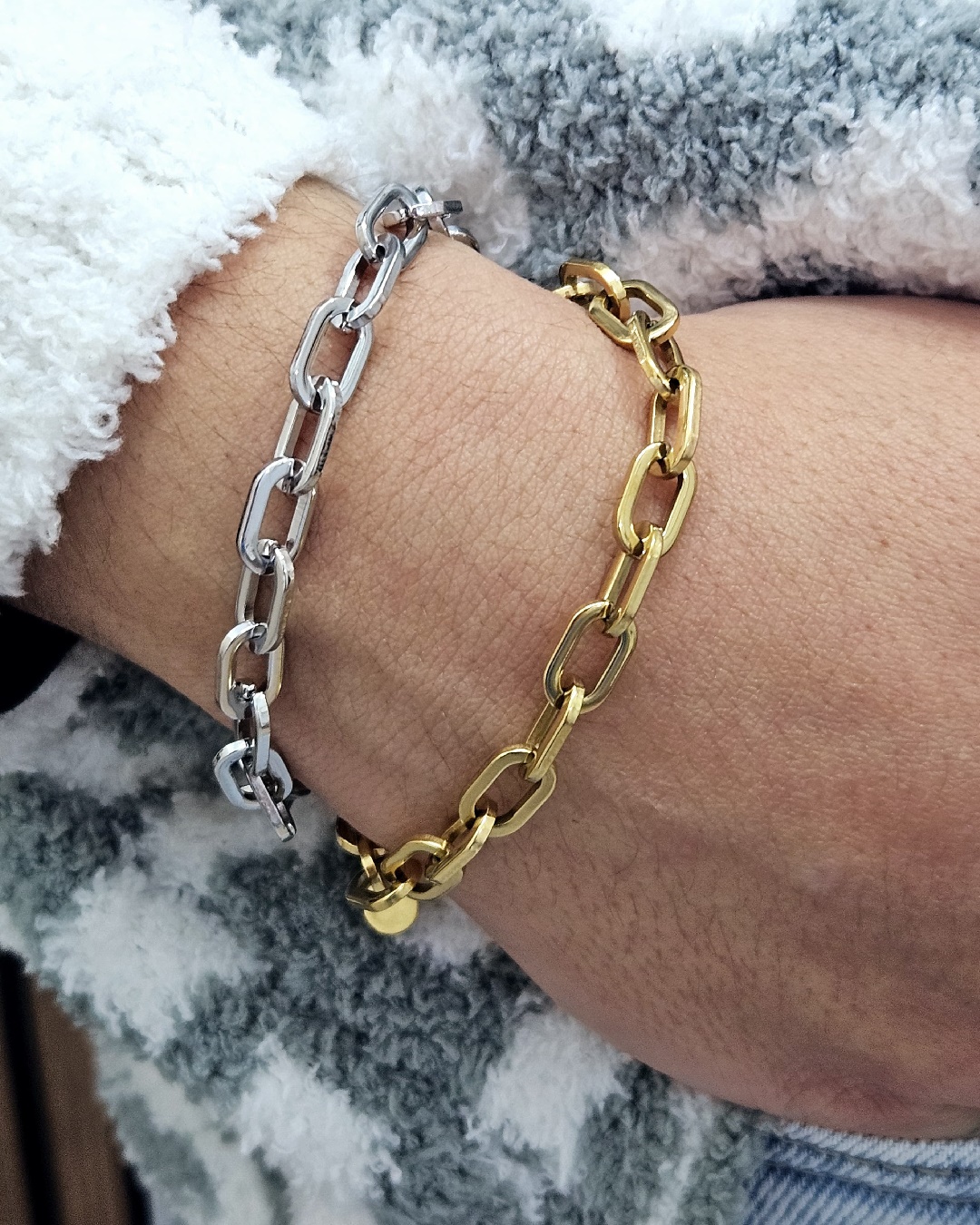 Una pulsera de eslabones grandes, perfecta para llevar como brazalete de diario. Combinala con cualquiera de tus joyas. Fabricado con acero inoxidable y baño de oro de alta calidad ✨, nuestra pulsera garantiza una durabilidad excepcional y una resistencia impecable al desgaste diario. Su diseño ajustable permite adaptarse a varias medidas de muñeca. 100% Waterproof🌊